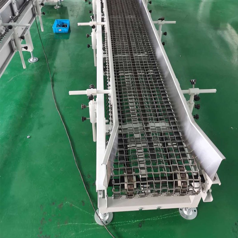 输送带的材质有:碳钢、不锈钢、热塑链,根据您的产品的需要可选取不同宽度、不同形状的链板来完成平面输送、平面转弯、提升、下降等要求。